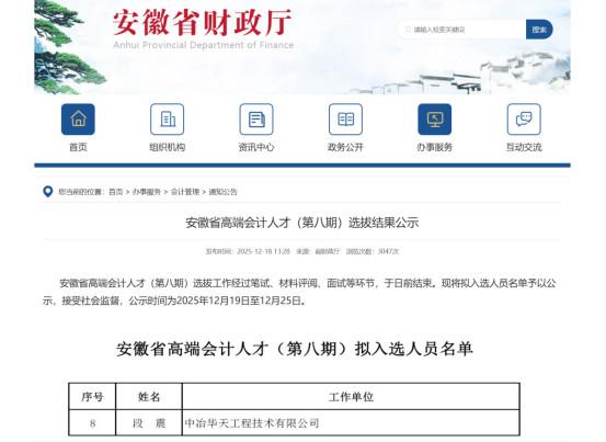 12月18日,安徽省財(cái)政廳公布“安徽省高端會(huì)計(jì)人才”(第八期)錄取人員名單,經(jīng)過材料評(píng)審、現(xiàn)場(chǎng)筆試、專家面試等多輪考核,中冶華天財(cái)務(wù)管理部員工段震從眾多候選人中脫穎而出、成功入選,有力展現(xiàn)了華天財(cái)務(wù)人員的綜合實(shí)力與向上風(fēng)采!